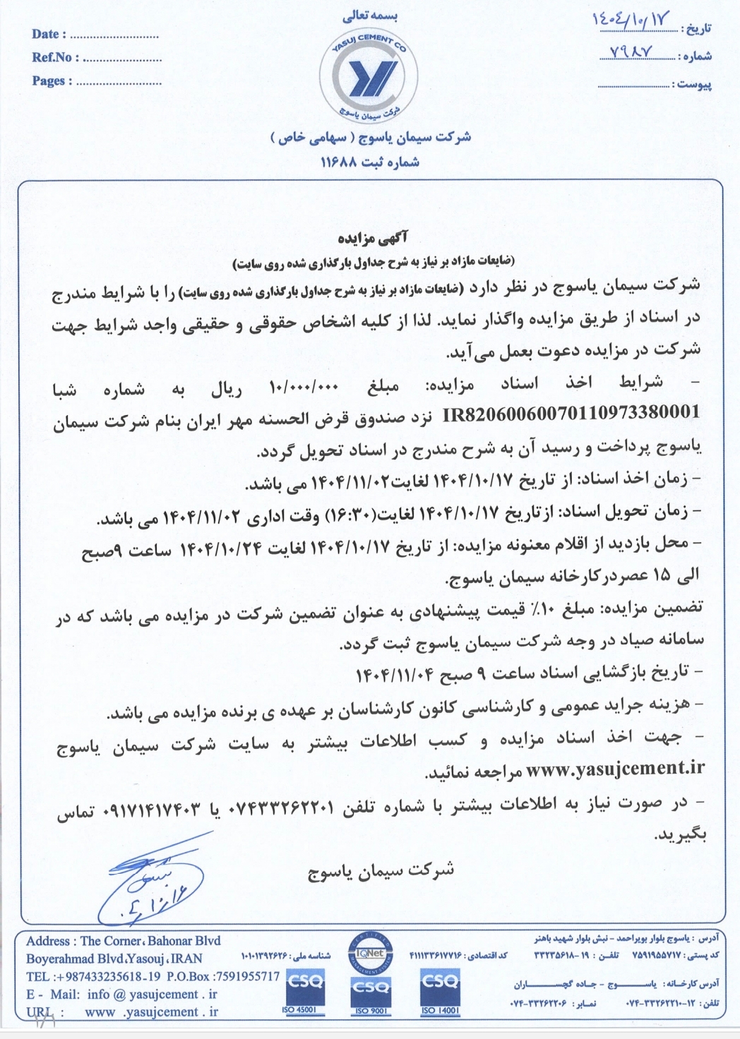 4) اعلام نتایج در تاریخ 1404/10/15 در سایت سیمان یاسوج به آدرس https://yasujcement.ir